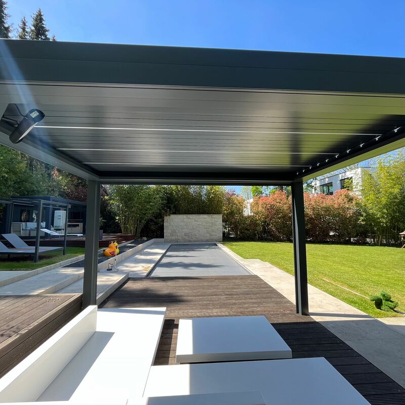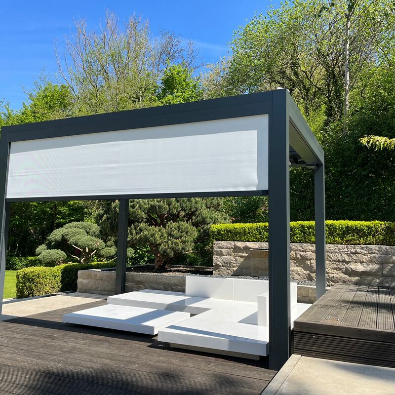 Die in die Pergola integrierte Beleuchtung sorgt für eine stimmungsvolle Atmosphäre und lässt Sie den Außenbereich auch bei Dunkelheit nutzen. Ob beim gemütlichen Abendessen oder einem entspannten Abend mit Freunden – die angenehme Beleuchtung macht Ihre Terrasse zu einem ganzjährigen Treffpunkt.