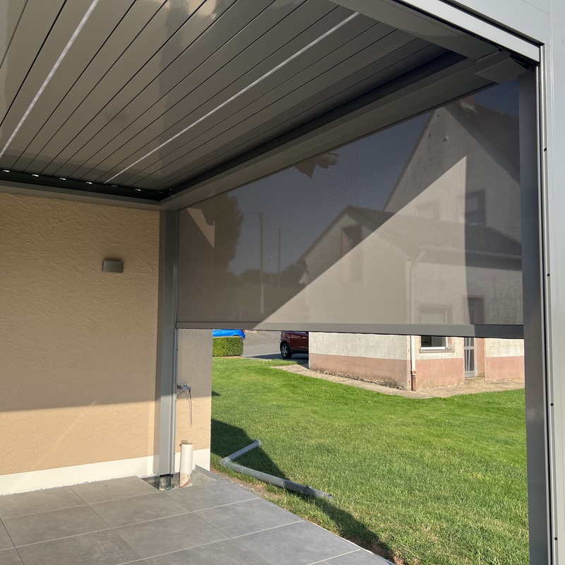 Die seitlichen Sonnenschutz-Elemente bieten Schutz vor leichten Windböen und schaffen eine angenehme Atmosphäre auf Ihrer Terrasse. Für noch mehr Schutz bei stärkerem Wind können Sie zusätzliche Glasschutzwände integrieren, die den Wind zuverlässig abhalten und Ihre Pergola bei jedem Wetter nutzbar machen.